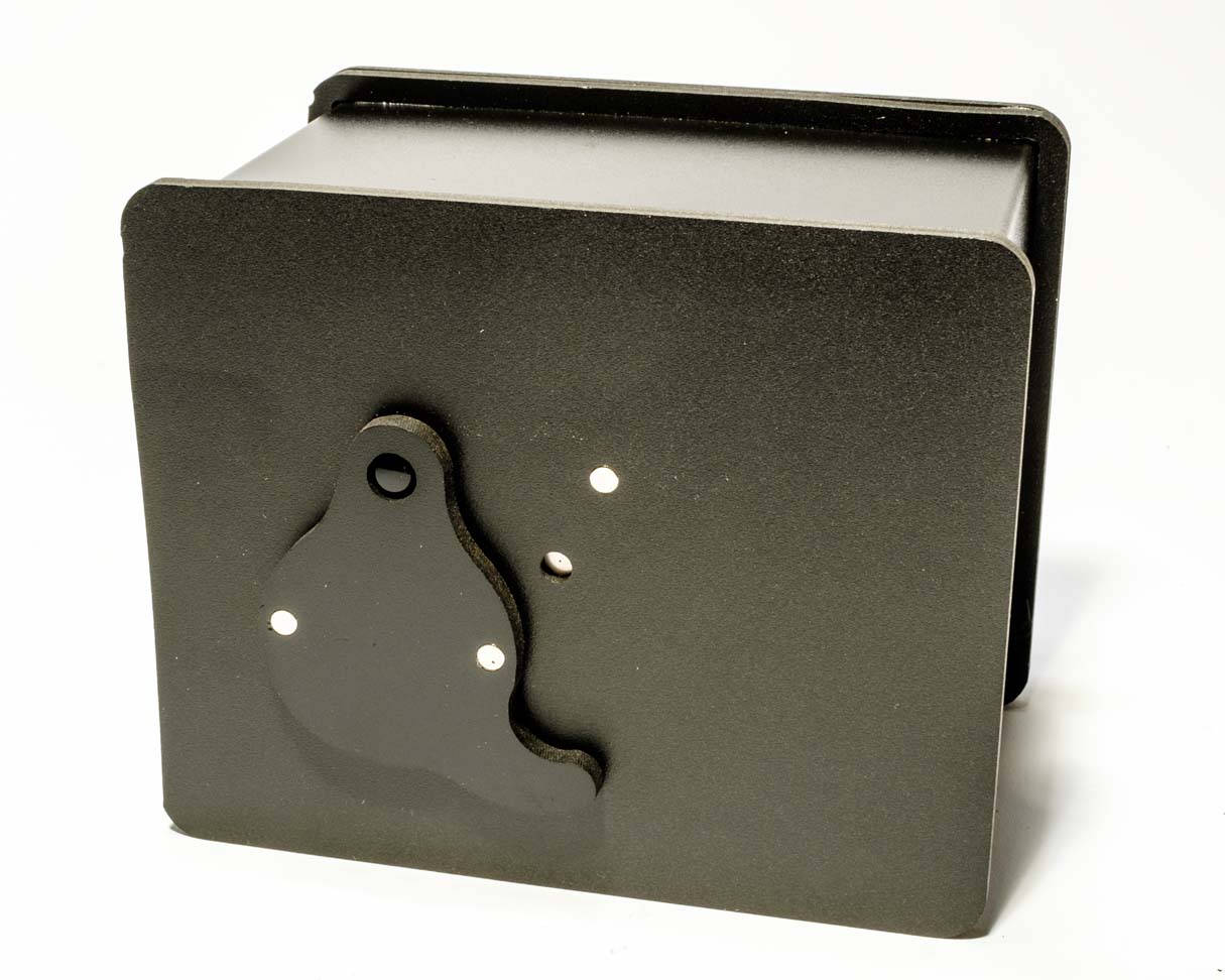 The pinhole is laser-cut and very precise - about f: 248...an optimal size for the 4" x 5" negative. The shutter is s simple rotary flap that is held closed or shut with those shiny magnets. There is a tripod socket in the bottom of the thing.