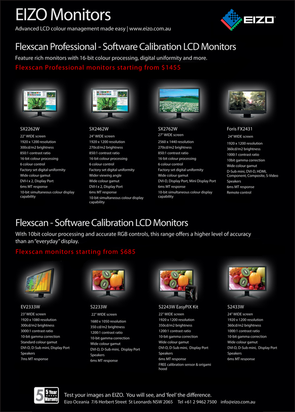 EIZO is the world leader in graphic monitors. EIZO monitors can reproduce up to 98% RGB colours and have a Look-Up table starting from 10 bit up to 16 bit. They come with a 5 year or 30,000 hour replacement warranty. Ask in store for a demonstration today.