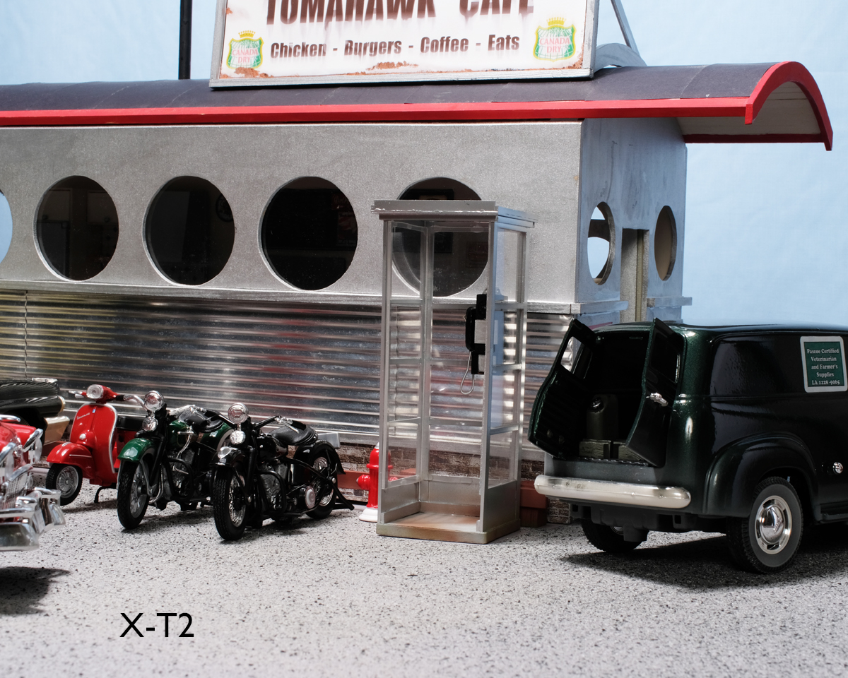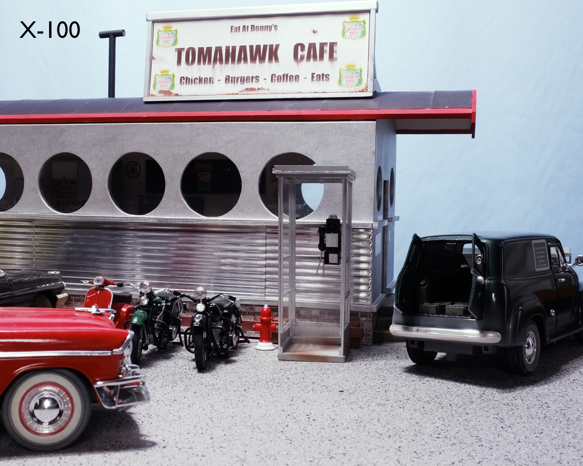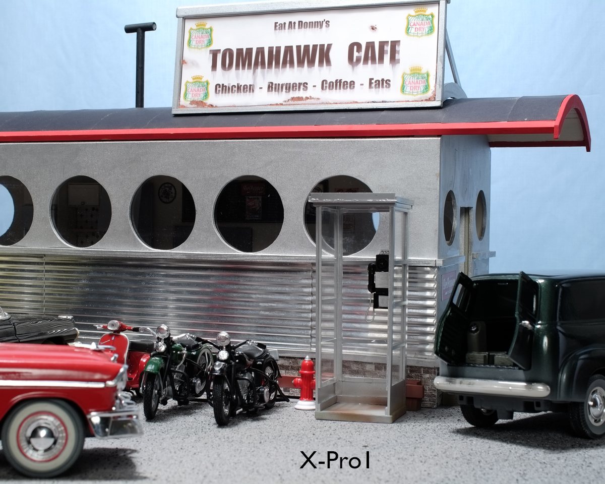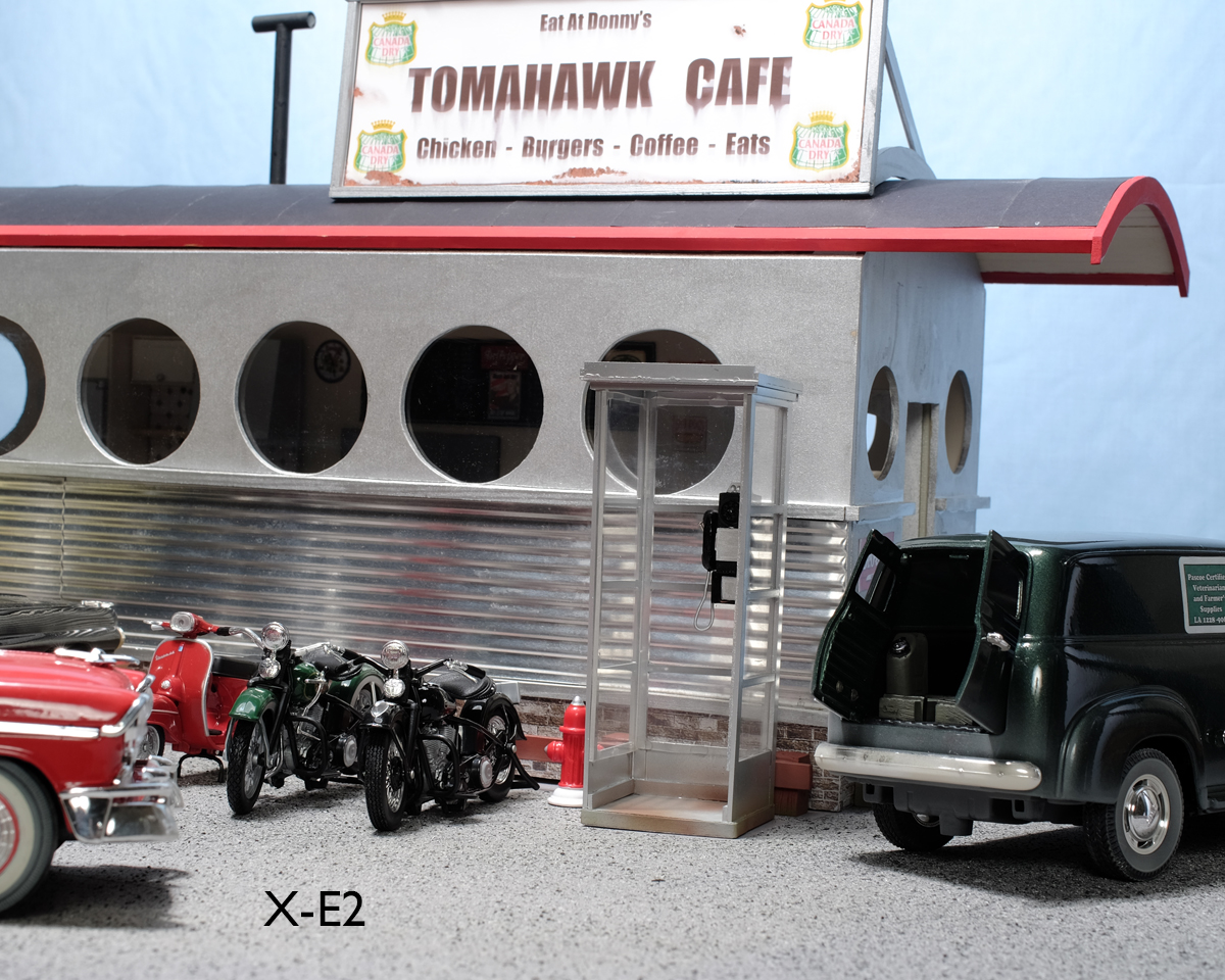The scene I used is the Tomahawk Cafe in Wet Dog, Alberta, August 1966. It is noon, and nothing is moving...probably all the way from Medicine Hat to Edmonton, but that is beside the point...The lighting is a constant and all the cameras have been set to a standard Kelvin temperature for it. Shutter speed is 1/250 for the X-T2 and X-100, 1/180 for the X-E2, and 1/125 for the X-Pro1. Aperture is f:16 in all cases, and as three of the bodies have interchangeable lens, a 35mm Macro lens was used in turn. The X-100 has a 23mm that is fixed but it can be switched to macro as well.