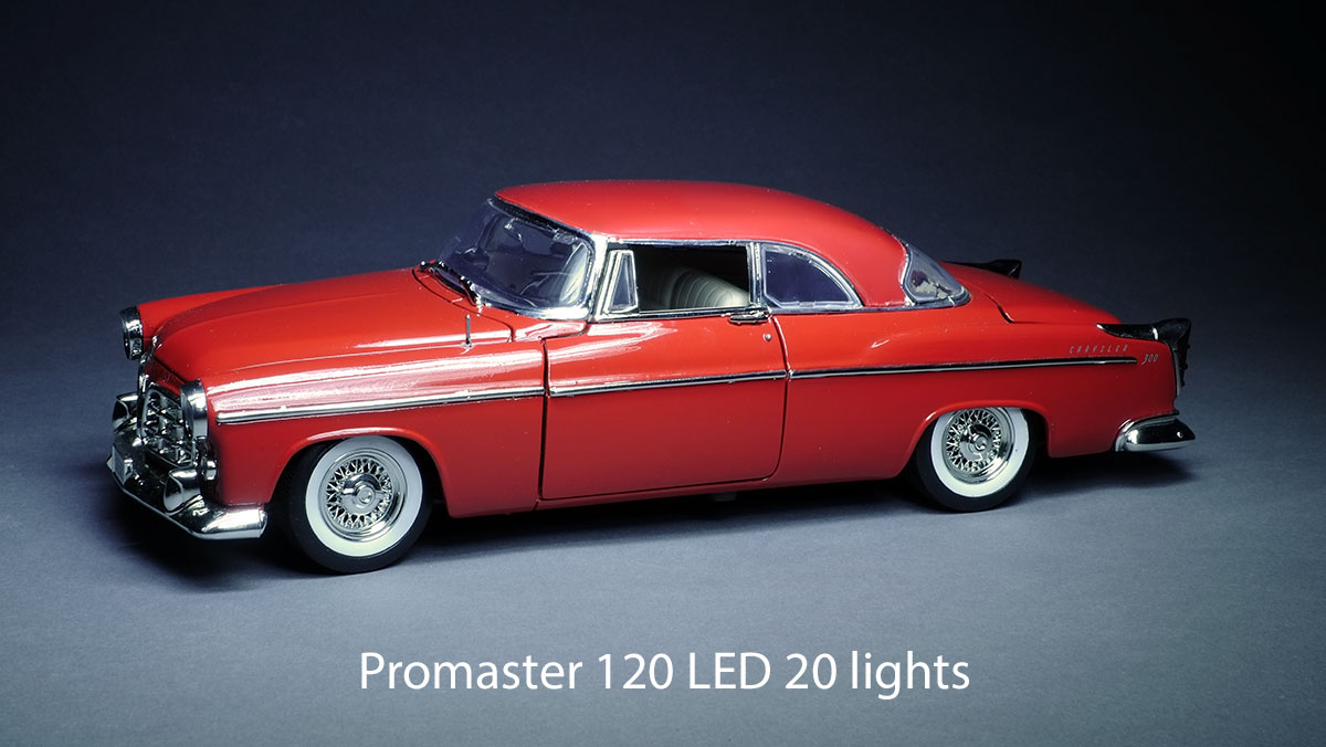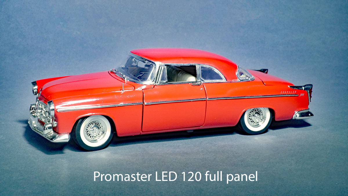 I tried it as illumination for a colourful studio car. The first idea involved a darkened studio and the whole panel lit up from several directions. The shutter on the camera was open on bulb while this was going on - 3 seconds at 200 ISO/f:11. The switch at the back was less convenient to use than the thumb switch of the Icelight 2 but then we're talking $50 vs $700. If I was going to use this technique extensively I would add a handle to the panel using the threaded socket in the base and put a thumb button on the handle.