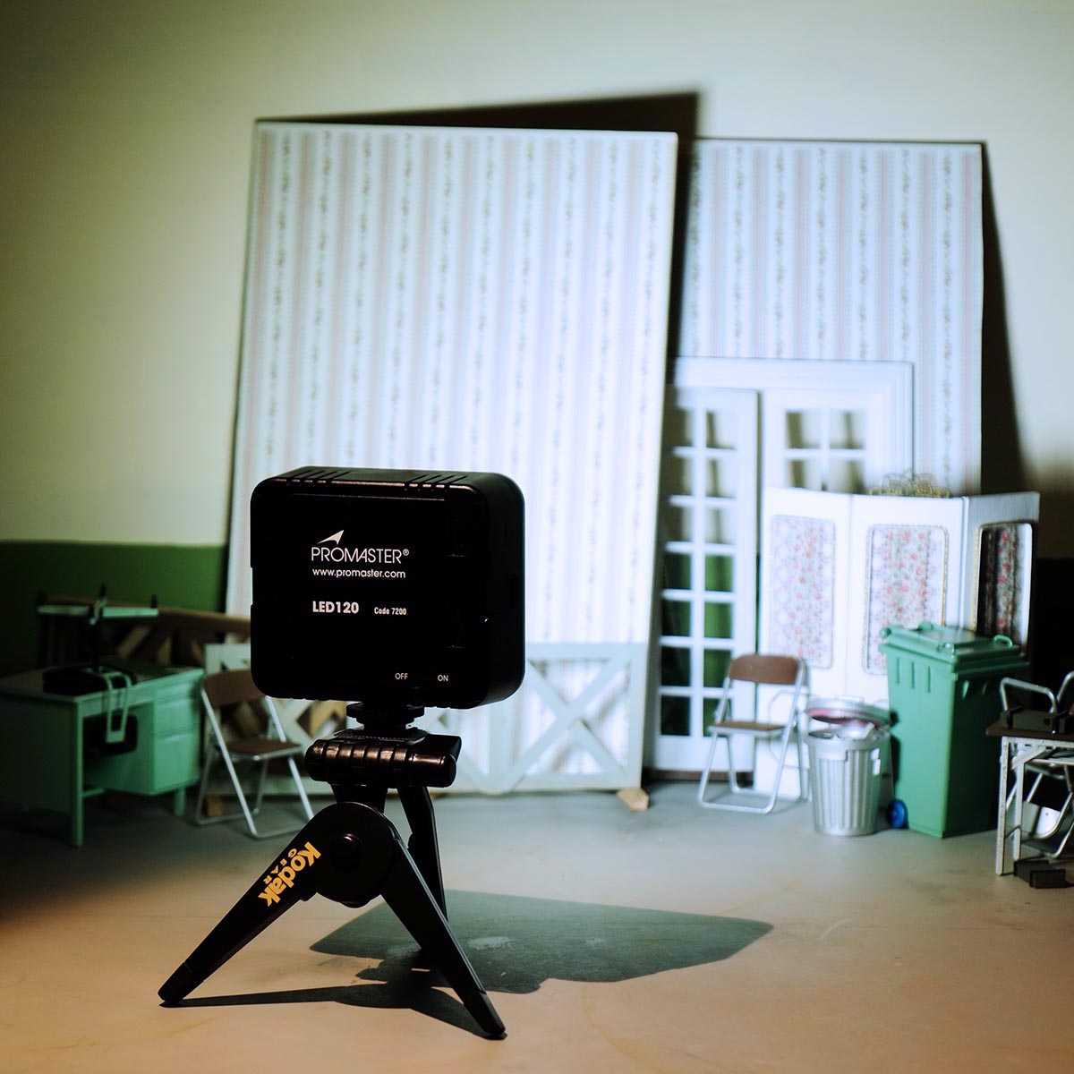 I grabbed a Promaster LED 120 panel with, you guessed it, 120 LED lights on the front. It runs from 4 standard AA batteries and has a simple on/off switch. There is a shoe mount with a standard 1/4" thread on the bottom and they throw in a small bracket to bolt it onto the bottom of a camera as well. The extra icing is provision of a plastic orange cover to compensate for tungsten lighting.