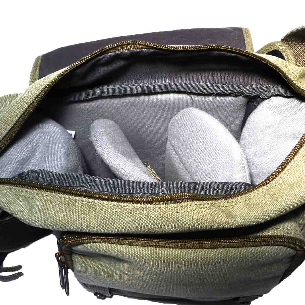 Inside there are three compartments ready-made that look to be able to hold the standard small DSLR and a couple of lenses or indeed any of the mirror-less systems. There's an external battery and card pouch and a documents slit in the back.