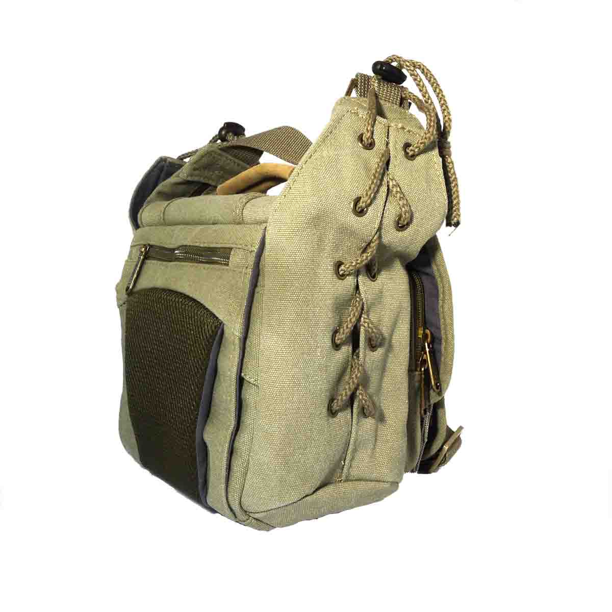 It's called the Adventure 25. Made of rugged khaki canvas with metallic zipper, buckles, and pop fasteners. The shoulder strap is webbing and there's a leather-covered handle. On the bottom are two rubber crash pads to hit the ground with.