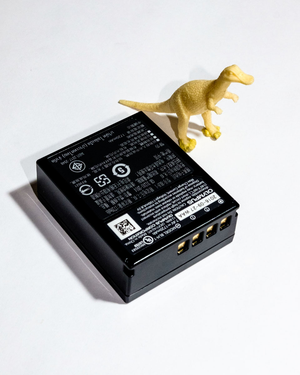 The battery is huge! I've seen smaller trays of lasagna...There should be enough capacity there for any reasonable shoot. As a way of measuring the size, that's a plastic dinosaur - and the battery is bigger. It holds 1720 mAh.