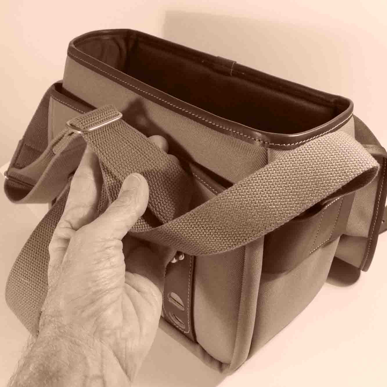 Look at the sepia-toned images of the Billingham f2.8. You can see that it is the model with the khaki cavalry twill bag and brown leather trim, but look closer to see the hand stitching on the edges and the solid brass fastening post. No wonder that Billingham has the word guarantee on their product booklet - and it is for 5 years. These are made with the same dedication that the English use for their finest shooting bags.