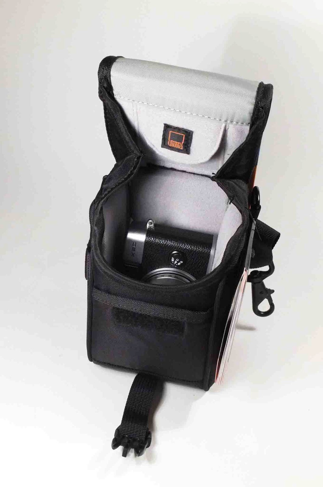 Traditional box pouch with a heavy shoulder strap - the roomiest option here and well suited for quick grabs of the camera. Plenty of room inside and on an outside pocket for cards and batteries. $ 45.00.