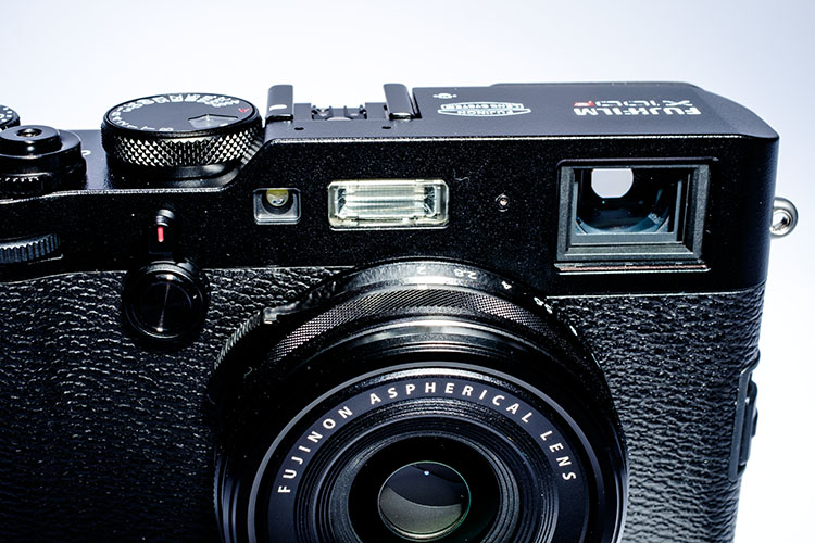 Well, the X100F shifts the elements of the design quite subtly - look at the direct front view to see that the AF assist light has moved, the on-board flash tube has climbed to a position closer to the vertical axis of the lens, and the EVF/OVF switch has acquired a center button that you can push it. It lets you shift the operation of the lens control ring to several functions. The front panel has also picked up a finger wheel - the instruction booklet says that it takes you through menu selections and formatting the cards amongst other things.