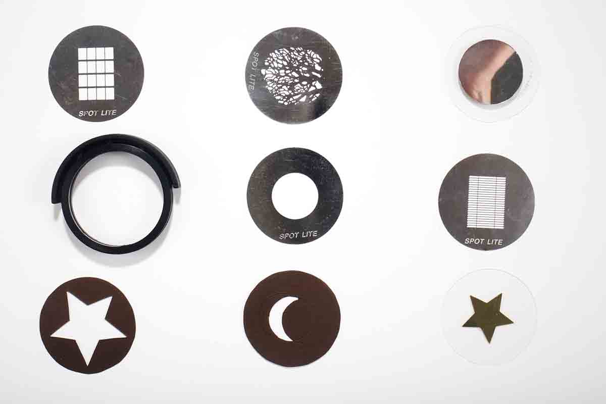 Or you can interpose a diaphragm in the correct optical point in the light path and have the Mini Spot project an image of that diaphragm. The gate is loaded with a two-part filter holder that sandwiches a circular plate in position. Elinchrom provide metal plates with some fun patterns laser-cut into them. There are two window patterns, a tree pattern, and a plain spot. You can easily cut additional diaphragms in whatever pattern you require - I made stars, crescents, and reverse spots myself. Your limited only by your imagination.