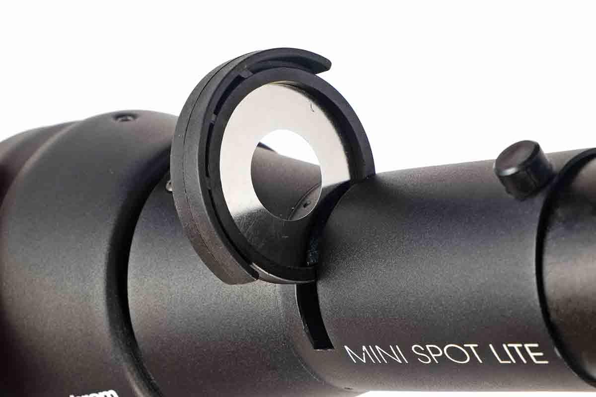 The central tube of the Mini Spot has a focussing lens - it is slid back and forth manually but can be locked into place with a thumb screw. It literally focuses the light of the flash to a certain plane out in front of the strobe - the same way a slide projector focuses upon a screen. It can focus plain light for a small round spot, or...