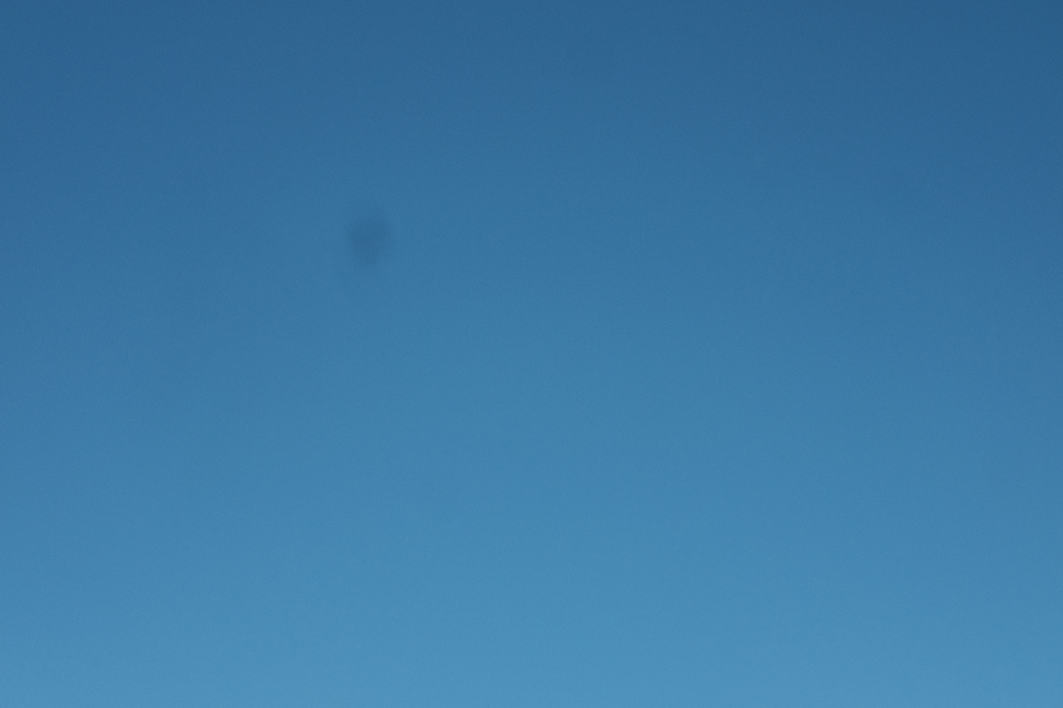 After I got home I decided to see if I could clean the sensor myself with a puff of air - I wouldn't touch the filter in front of a sensor with anything else - I leave that to the staff at Camera Electronic when it gets really bad - but figured a puff from a blower would be fairly safe. As the spot was in the upper left of the picture the offending dirt must have been in the lower right area - I puffed carefully all round the place and then took another diagnostic picture of a clear blue sky and small aperture.