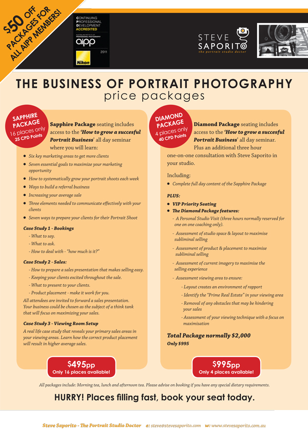 Camera Electronic are proud to present to you Steve Saporito - The Business of Portrait Photography Seminar. A seminar that no portrait photographer can miss. spots are limited to 20 so book now to avoid disappointment.