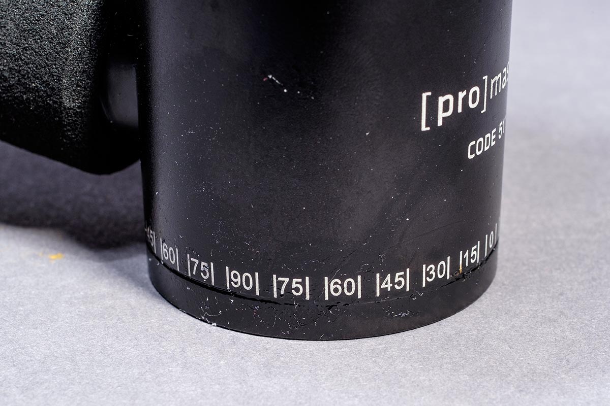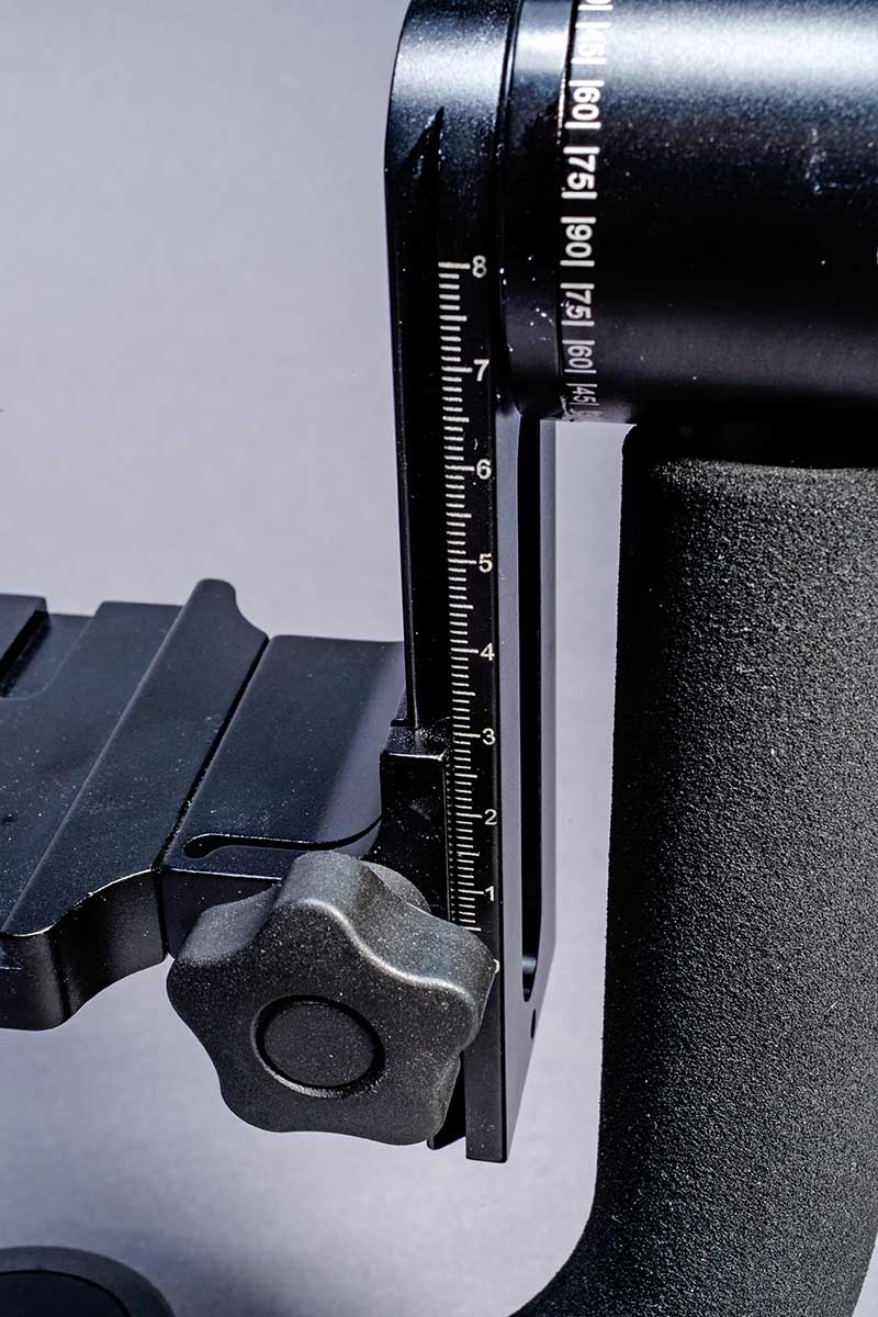 Like a gun mount, it has marked divisions on the turntable and on the horizontal axis. I can't really say why they are there because most photographers would not fire their cameras to instructions from a director, but perhaps they are there because it looks cool. The mounting platfom rises up and down to accommodate different lenses and there is a channel grip at the bottom of it that is stated on the box as " industry standard ". They really mean Arca -Swiss but they don't say it because I'll bet their lawyers warned them off.