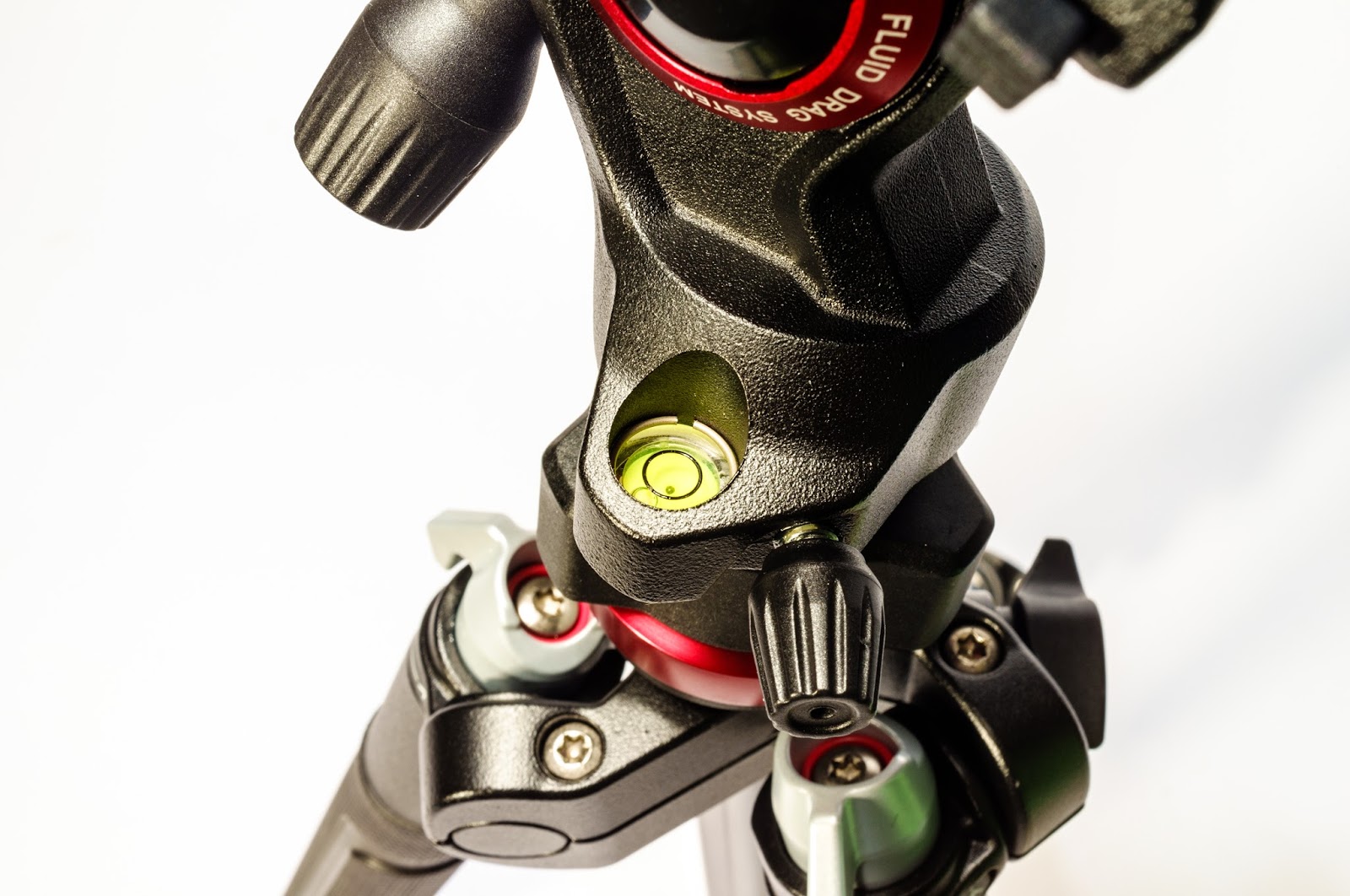 The part that departs is at the top of the centre column. Manfrotto have included a levelling cup - it is the part you see in red in the illustration with a locking collar above it. Like the bigger-cousin leveling heads on larger Manfrotto gear, this allows the videographer to set up the legs on ground than may have a pronounced slope and then correct the position of the video head so that it is absolutely level.