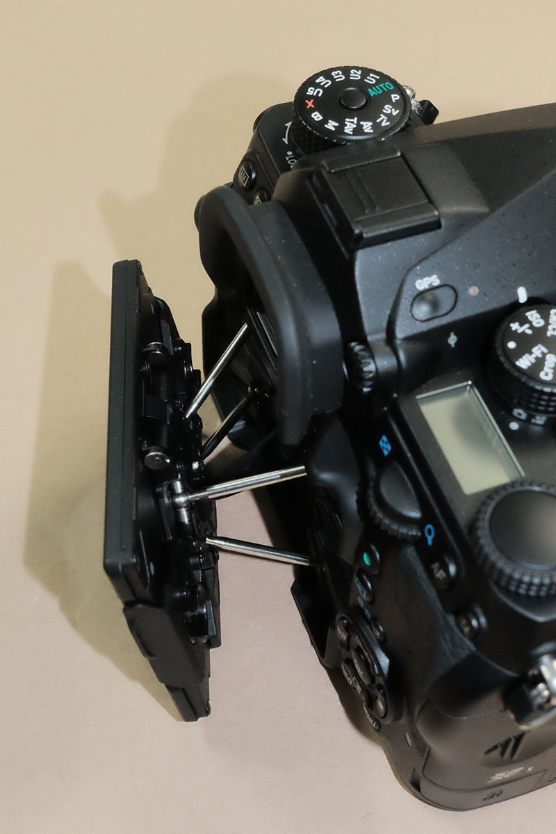 Okay. Pentax have taken a leaf from the makers of some monitor screens and attached the LCD assembly to the back of the new K-1 camera with four struts. This means it can go in far more positions for viewing without being stuck out of the side of the camera on a flimsy plastic swivel. You can sight through it in portrait mode without twisting your neck off. No small advantage in candid photography and an absolute godsend in tripod work in a studio. Note: once it goes to the end of he swivel arms it tilts up even further.
